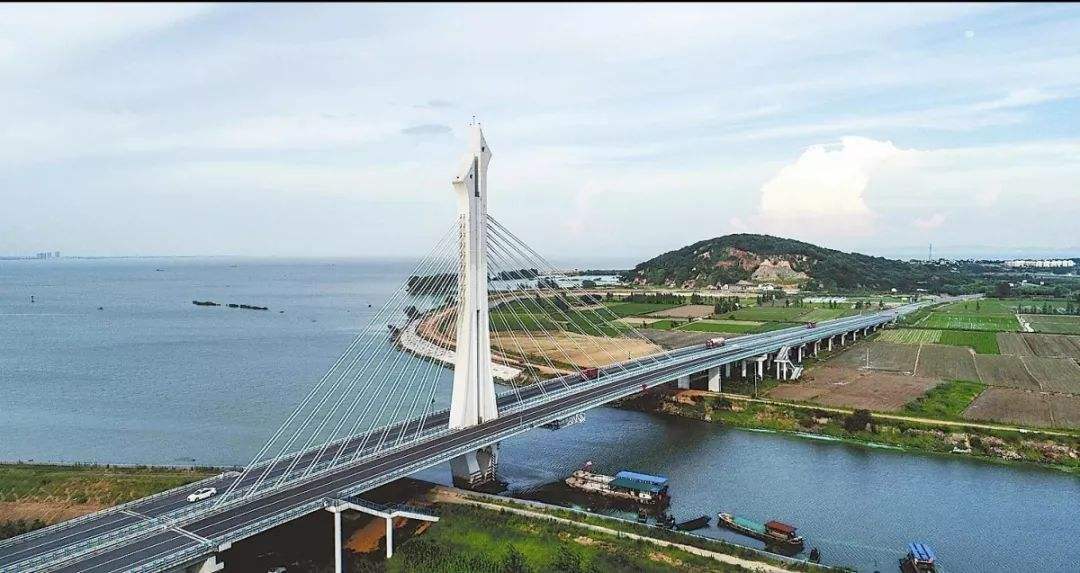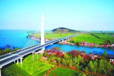 白石天河大桥位于白石天河入巢湖河口400m处,桥梁总长826m。这是一座白鹭塔混合梁斜拉桥,桥塔设计似两只相互依偎的白鹭,主塔和副塔呈高低错落的不同层次,斜拉索呈横向双排布置。主桥跨径布置为80m+130m,河流中的桥墩布置在一侧岸边,为桥下通航预留最大空间。